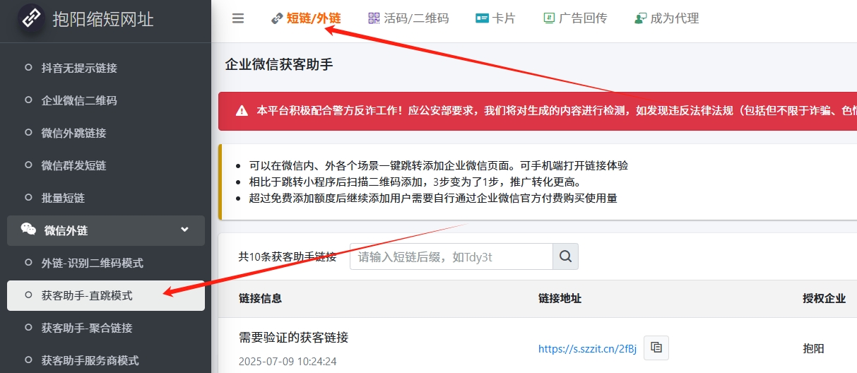 选择【短链/外链】-【获客助手-直跳模式】,这里新建链接,