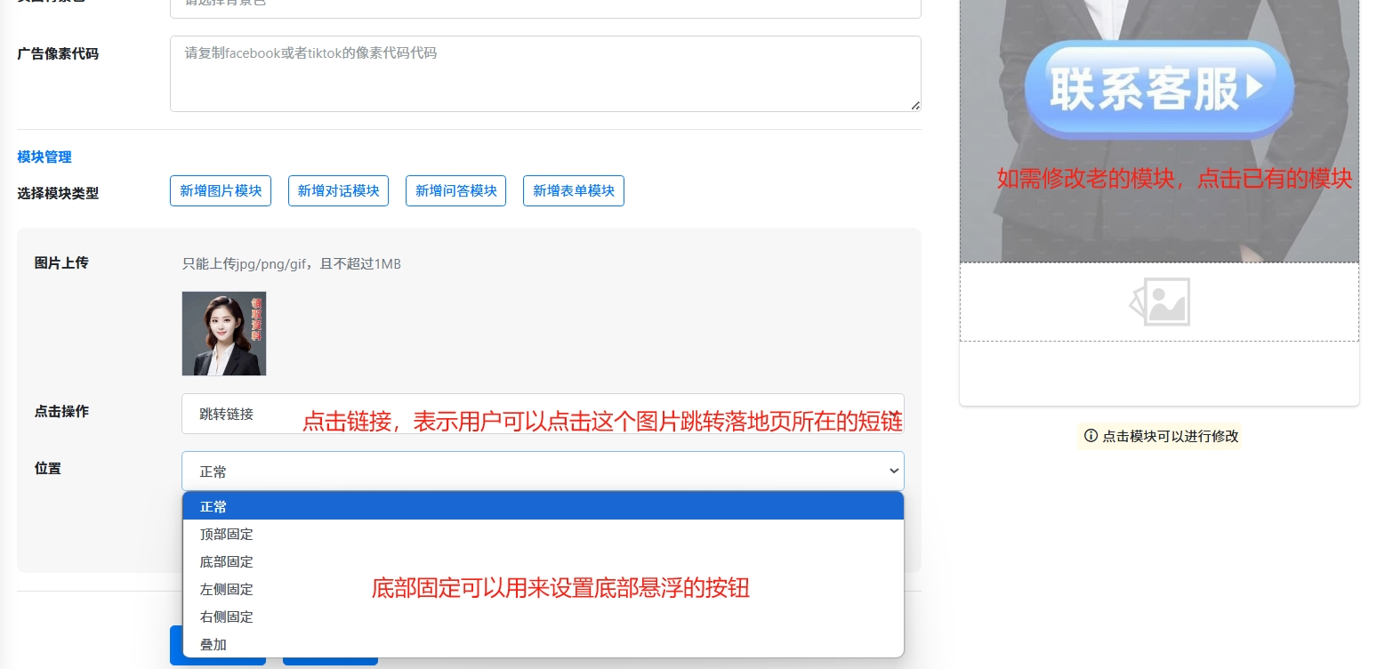 点击【新增图片模块】,可以制作最简单的落地页,点击图片跳转到目标页面