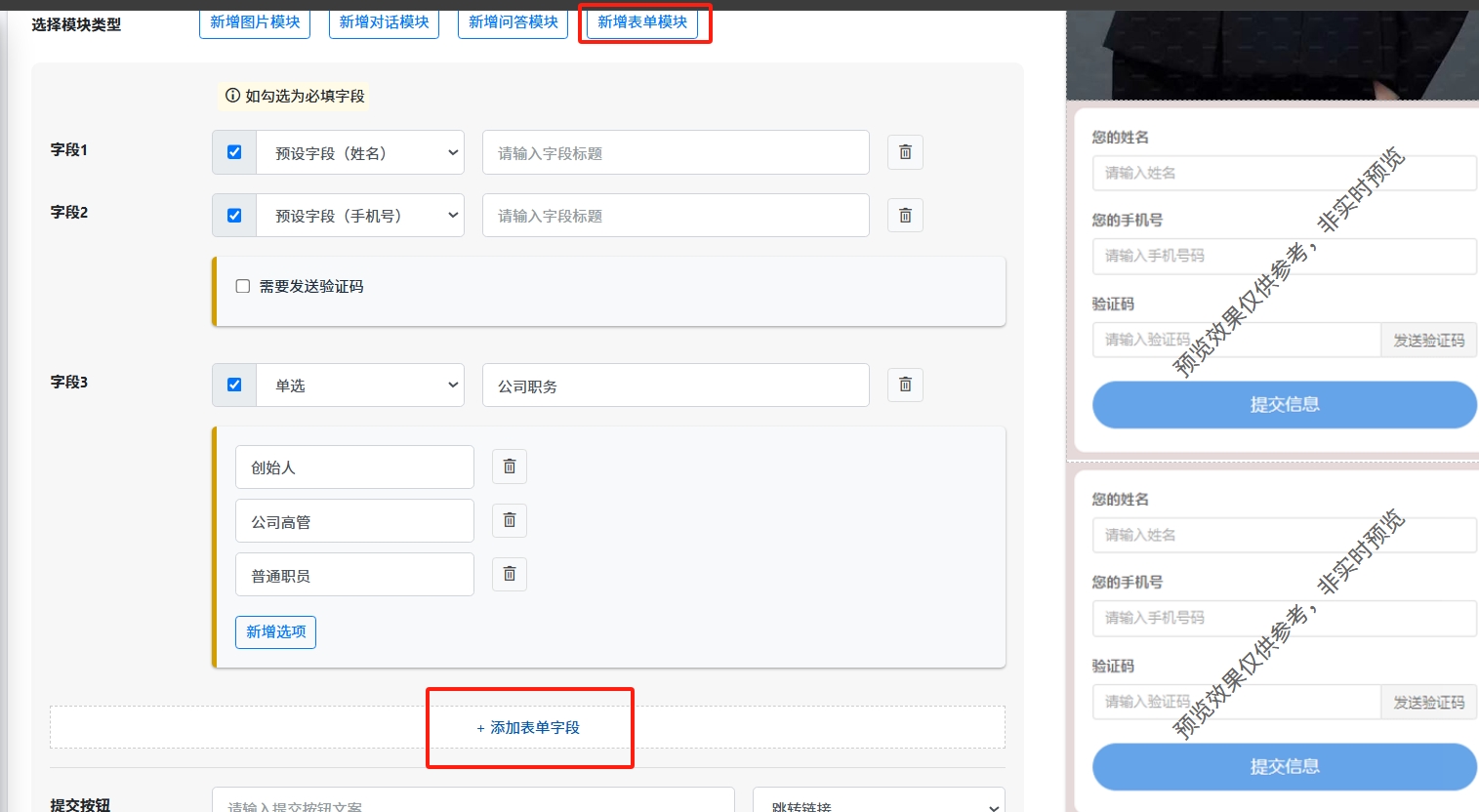 点击【新增表单模块】,需要用户提供一定的信息,如电话等,再跳转到目标页面,同时在留资报表中可以看到用户提交的信息