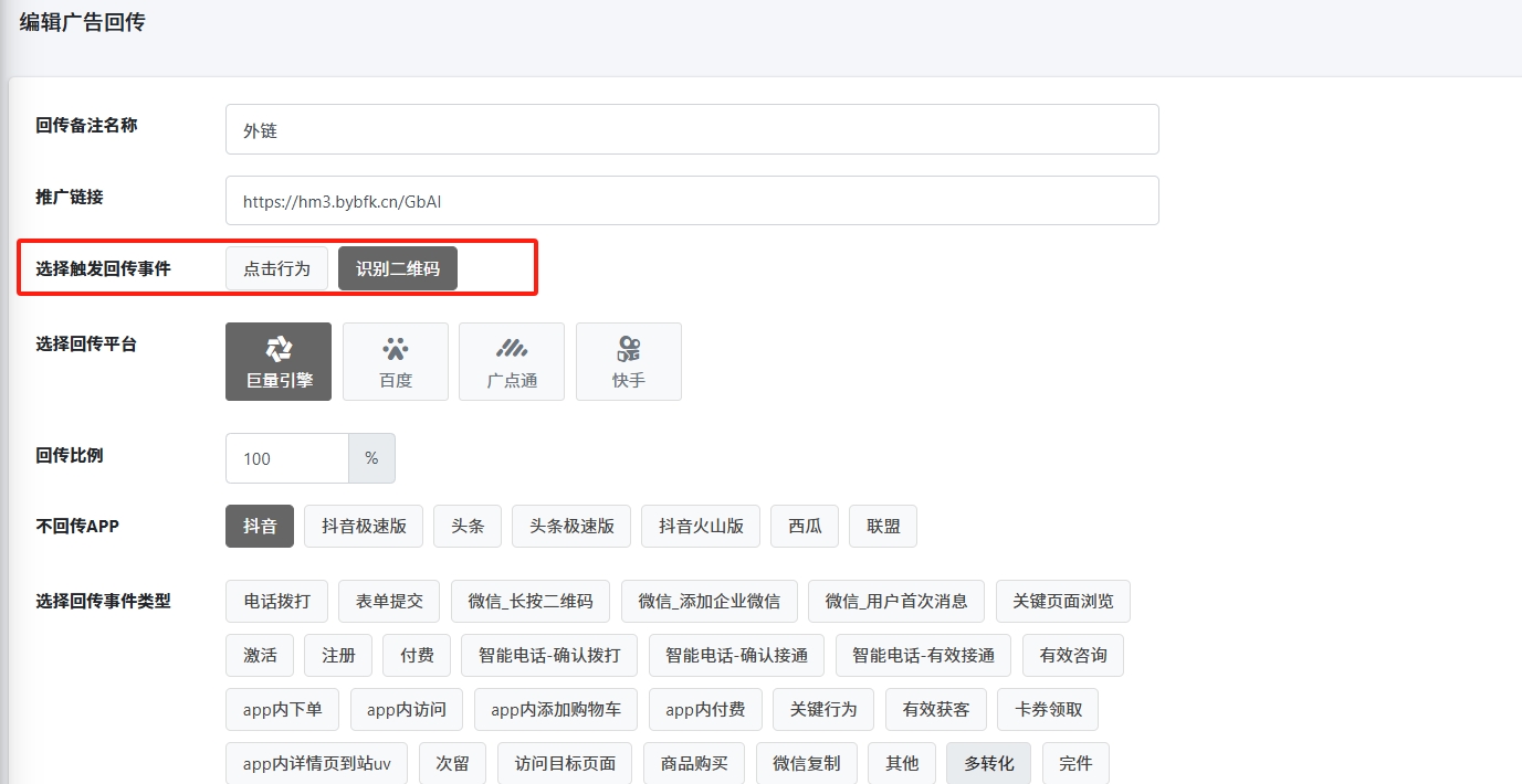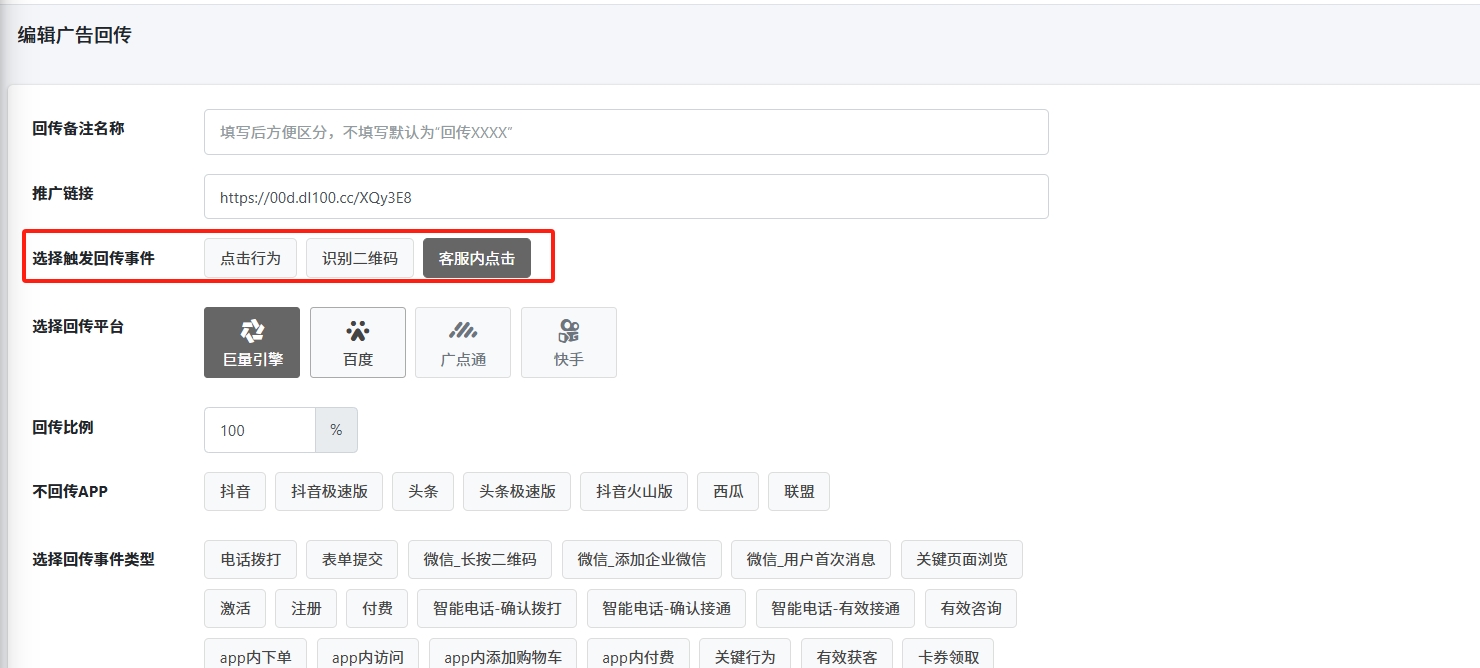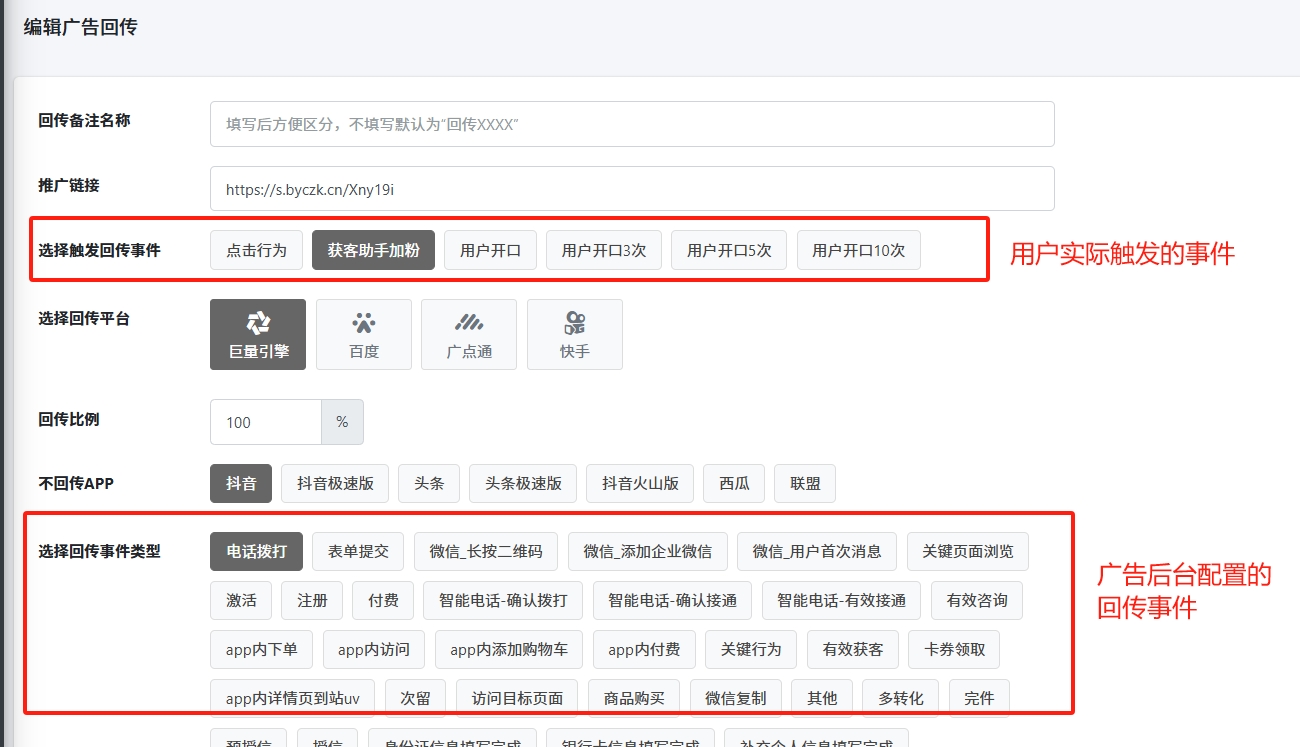 这里配置短链的事件和广告后台的回传事件之间的关联,进而实现自动回传广告效果