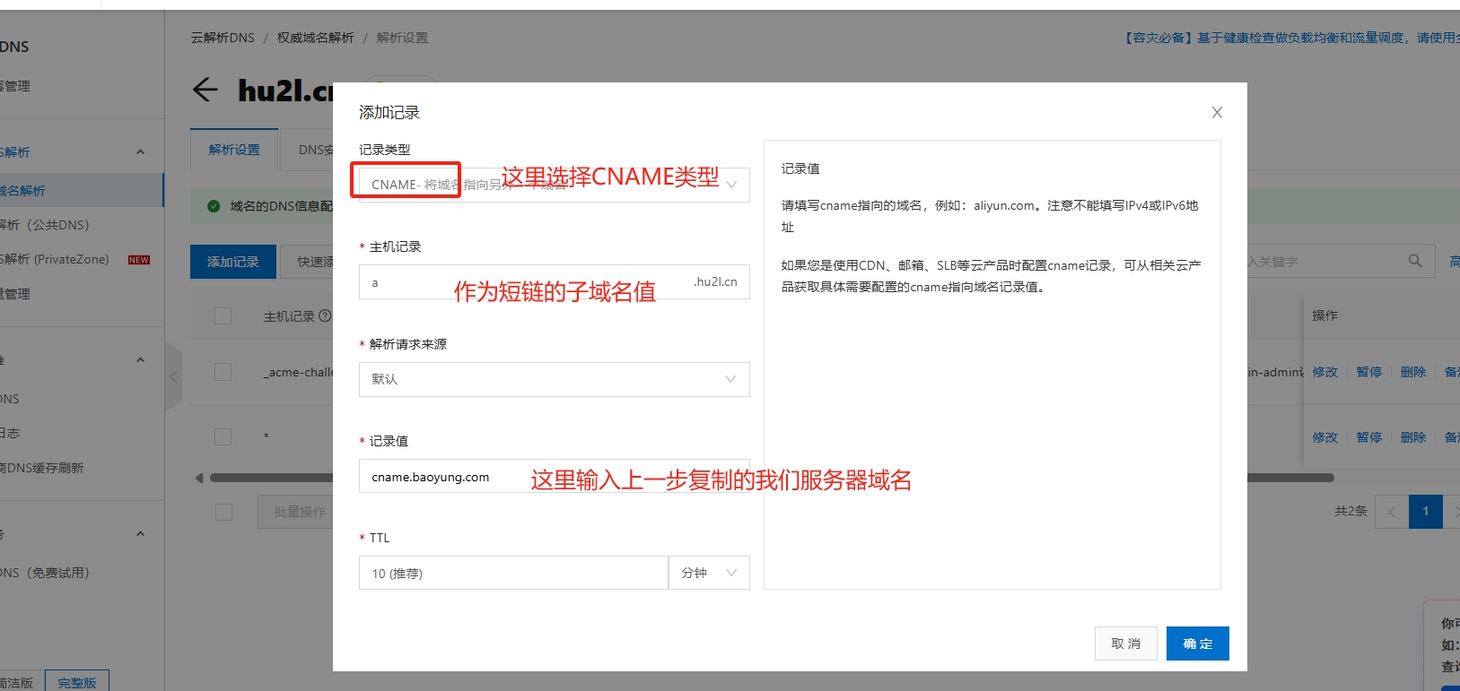 如下是阿里云注册备案域名流程,点击 注册完成后需求去备案域名,备案需要备案号,可以直接购买备案号(100元/个),或者购买最便宜的主机(99元/年)送5个备案号(推荐),根据备案流程完成备案 进入管理后台->专属设置-域名管理 输入你自有的域名(必须为阿里云备案域名),可以为二级子域名,这样可以不影响你原有的业务。例如你的域名为 mydomain.com,可以这里提交一个a.mydomain.com作为短链域名. 复制我们的CNAME,到阿里云配置 到阿里云域名列表,点击解析 设置CNAME记录 设置完成后,等待我们审核通过即可使用 如果需要设置SSL证书,请提供nginx证书给客服,等待我们技术配置, 查看如何获取SSL证书 如果你的域名不是阿里云注册备案的,请参照 阿里云备案帮助文档,或者联系阿里云客服备案