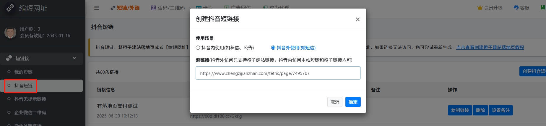 也可以直接把橙子建站链接,转化为v.douyin.com的链接