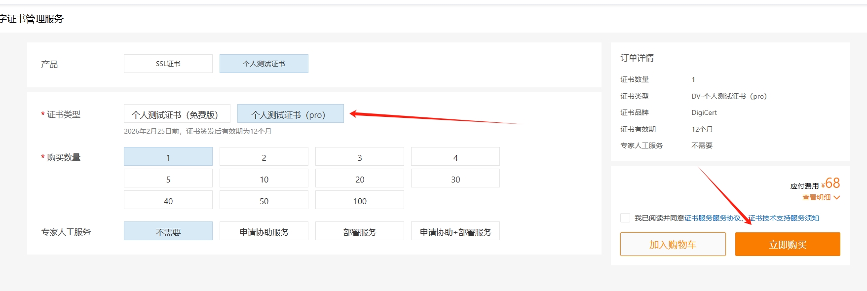 - 选择【个人测试证书pro】,选择1年有效期,然后下单购买