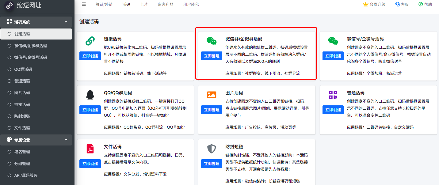 进入管理后台->活码系统->微信群/企微群活码
