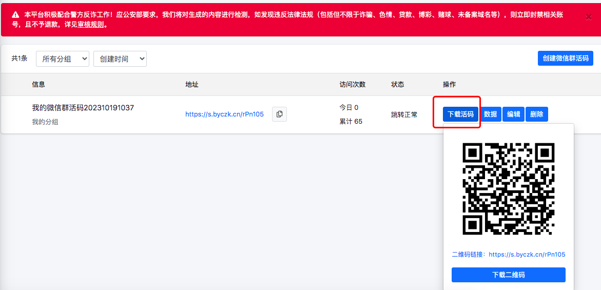 下载永久有效的活码,可以打印于线下张贴,或者发布于网络社交媒体等
